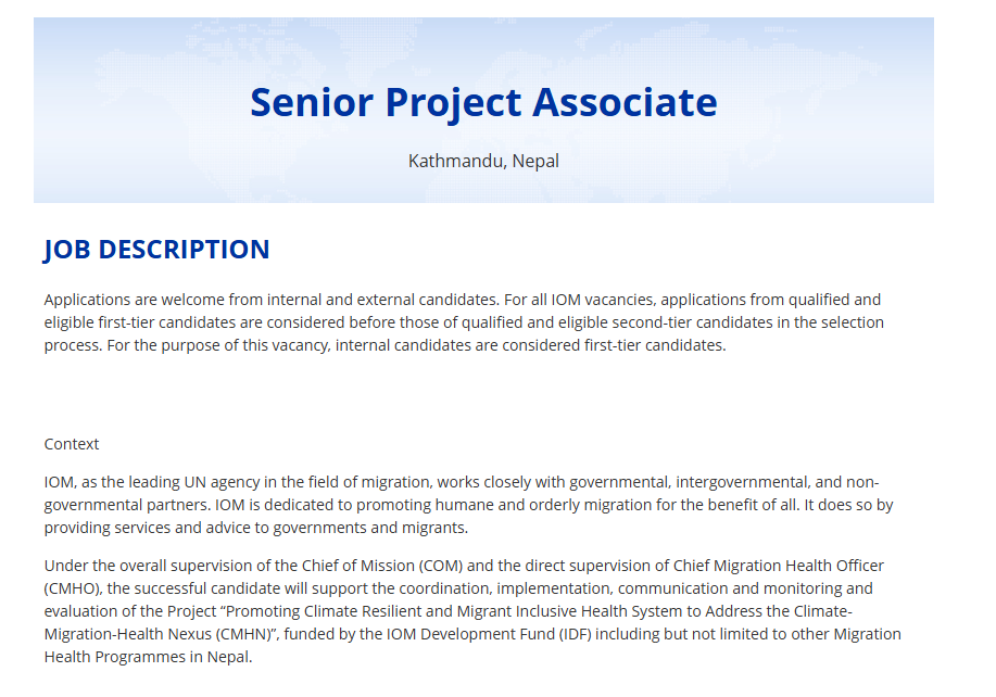 Under the overall supervision of the Chief of Mission (COM) and the direct supervision of Chief Migration Health Officer (CMHO), the successful candidate will support the coordination, implementation, communication and monitoring and evaluation of the Project “Promoting Climate Resilient and Migrant Inclusive Health System to Address the Climate-Migration-Health Nexus (CMHN)”, funded by the IOM Development Fund (IDF) including but not limited to other Migration Health Programmes in Nepal.